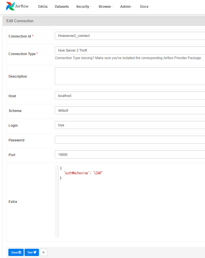 Admin - Connections์์ ์๋ก์ด Connection์ ์์ฑํ๊ณ ์๋์ ๊ฐ์ด Connection Type, Host, Login(username), Port ์์ฑ ํ Extra์ ์๋ ๋ด์ฉ ์์ฑ